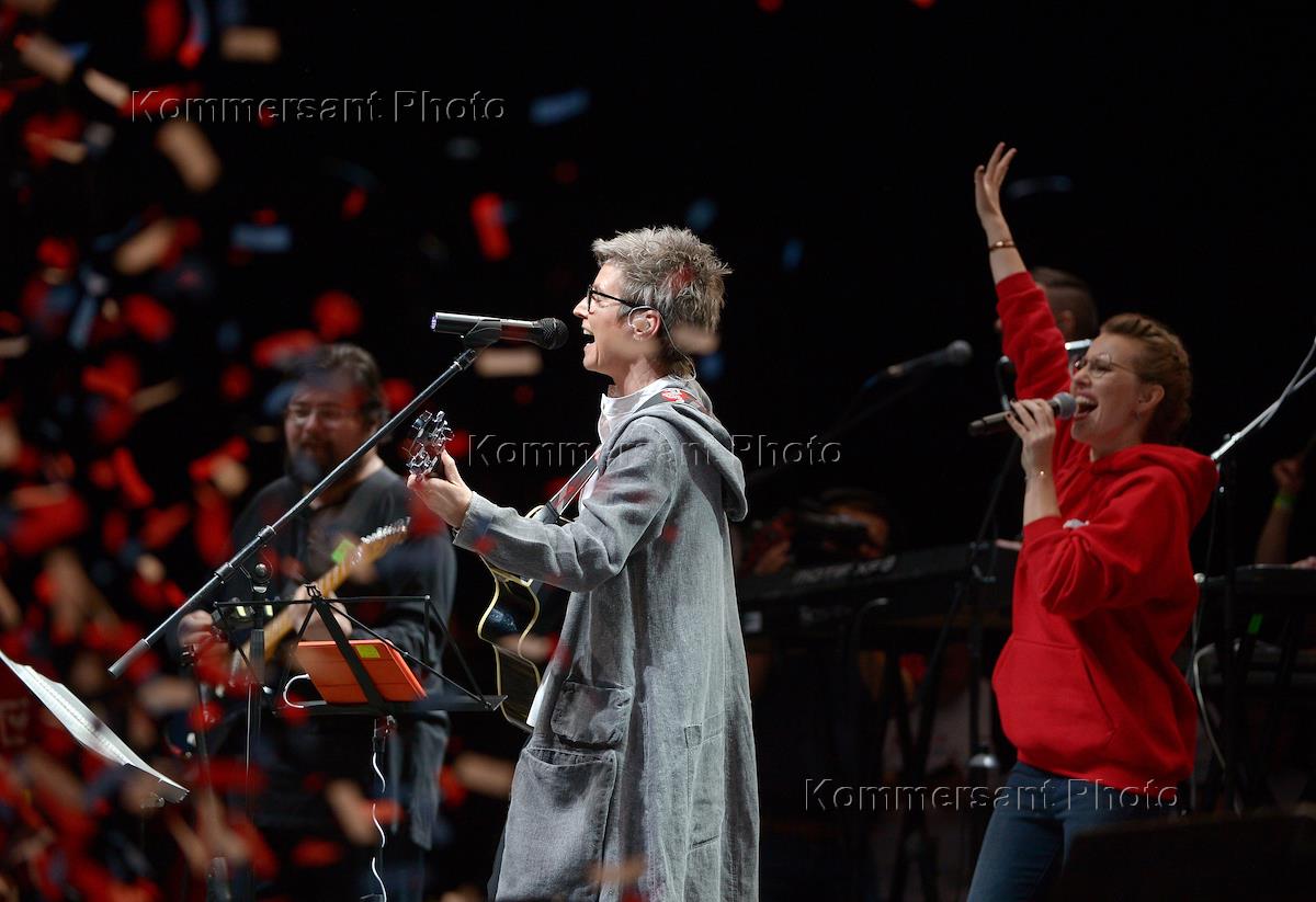 Presidential candidate of Russia from the party "Civic Initiative" Ksenia Sobchak held the meeting with voters at Adrenalin Stadium club. Presidential candidate of Russia from the party "Civil Initiative" Ksenia Sobchak (left) and the leader of the band "Surganova and Orchestra" Svetlana Surganova (right) during the meeting.