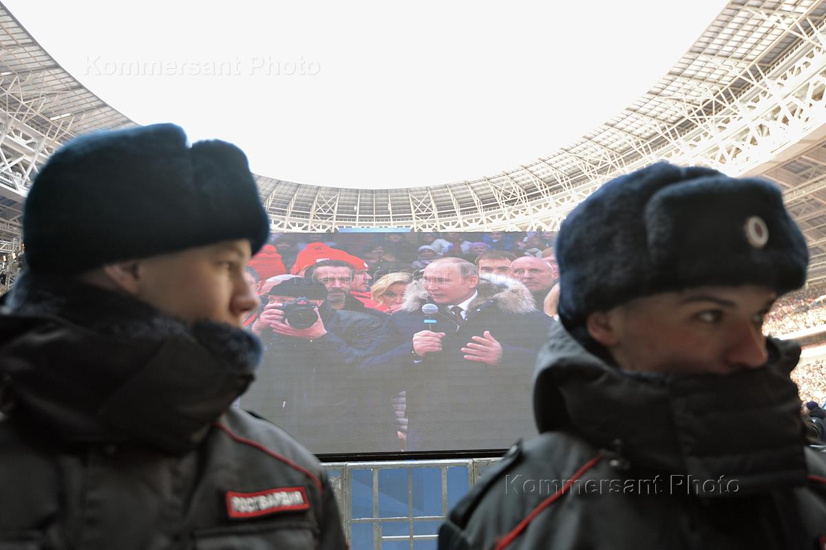 Митинг-концерт "За сильную Россию!" в поддержку кандидата в президенты России Владимира Путина прошел на стадионе "Лужники". Полицейские во время дежурства на митинге.