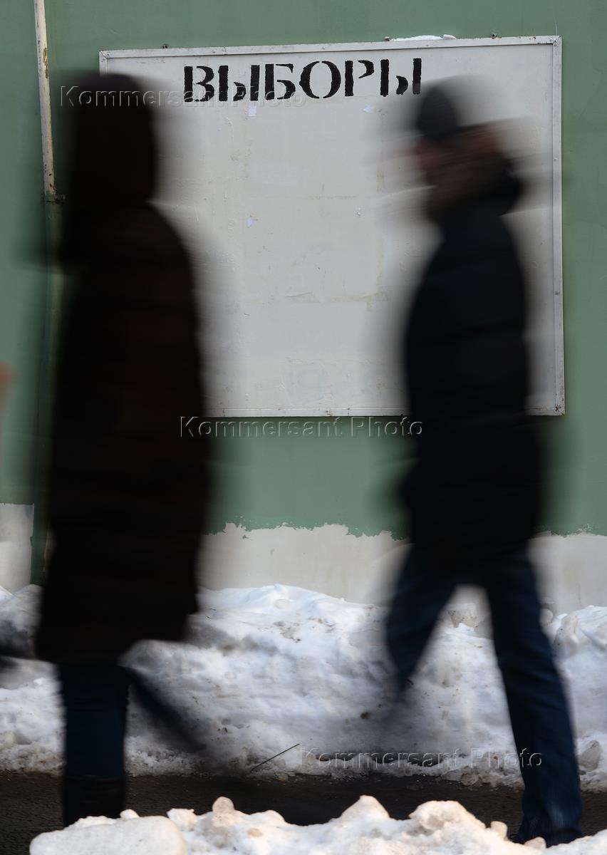 Жанровая фотография. Силуэты людей на фоне пустого информационного щита "Выборы".