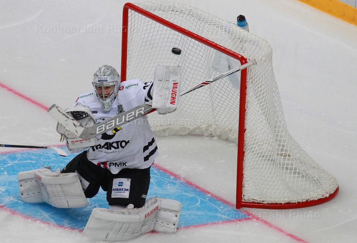 Матч полуфинала восточной конференции Кубка Гагарина между командами "Салават Юлаев" (Уфа) и "Трактор" (Челябинск) прошел на стадионе "Уфа-Арена". Вратарь команды "Трактор" Павел Францоуз во время матча.