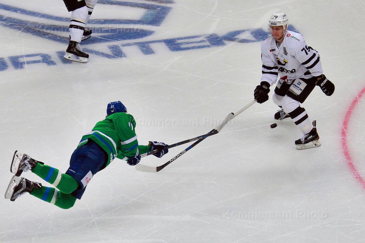 Матч полуфинала восточной конференции Кубка Гагарина между командами "Салават Юлаев" (Уфа) и "Трактор" (Челябинск) прошел на стадионе "Уфа-Арена". Игрок команды "Салават Юлаев" Григорий панин (слева) и игрок команды "Трактор" Виталий Кравцов (справа) во время матча.