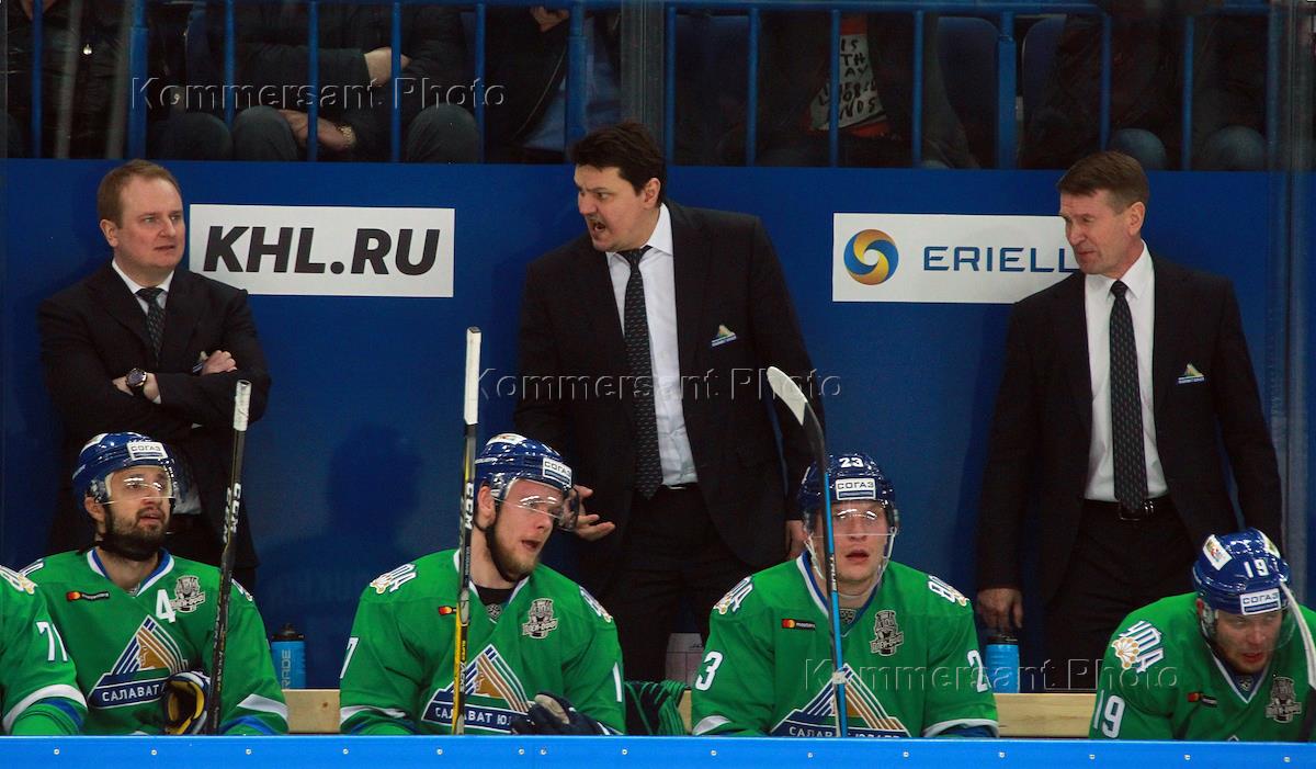Матч полуфинала восточной конференции Кубка Гагарина между командами "Салават Юлаев" (Уфа) и "Трактор" (Челябинск) прошел на стадионе "Уфа-Арена". Главный тренер команды "Салават Юлаев" Эркка Вестерлунд (справа) во время матча.
