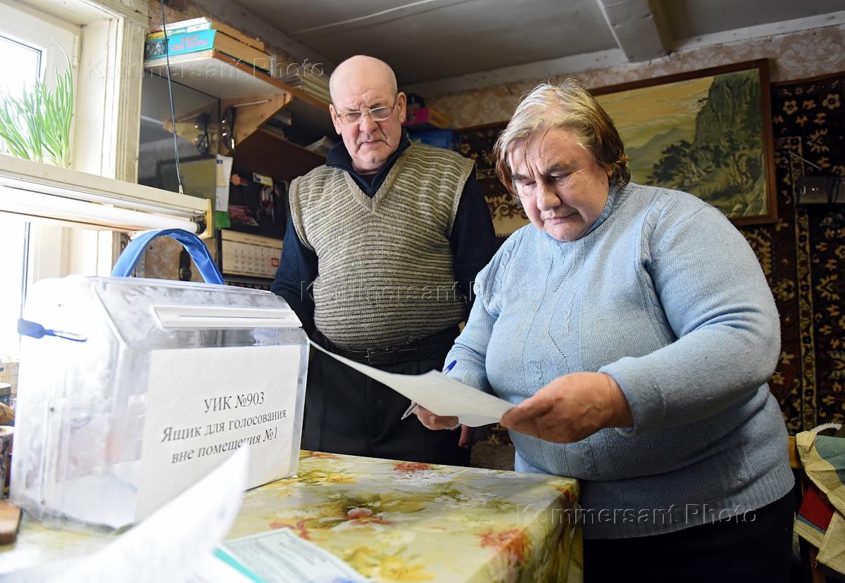 Выборы президента России. Голосование в поселке Шапки Ленинградской области. Избиратели во время выездного голосования. Тимофеевы Вячеслав Алексеевич Любовь Яковлевна