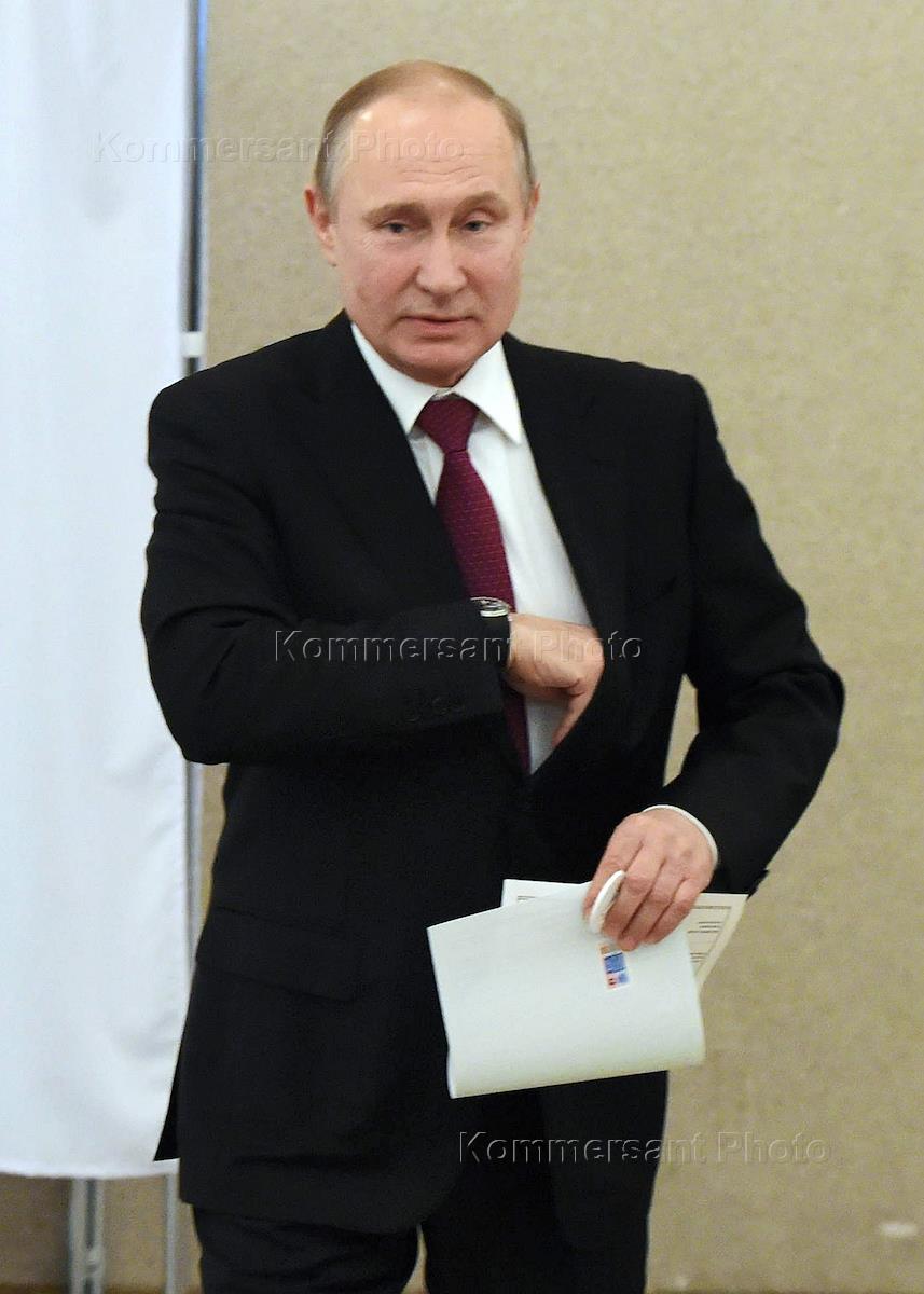 Выборы президента России. Кандидат в президенты России, действующий президент России Владимир Путин во время голосования на избирательном участке №2151 в Президиуме РАН.