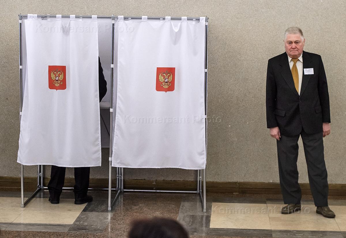 Выборы президента России. Председатель участковой избирательной комиссии (УИК) 2151 Виктор Лындин на избирательном участке.