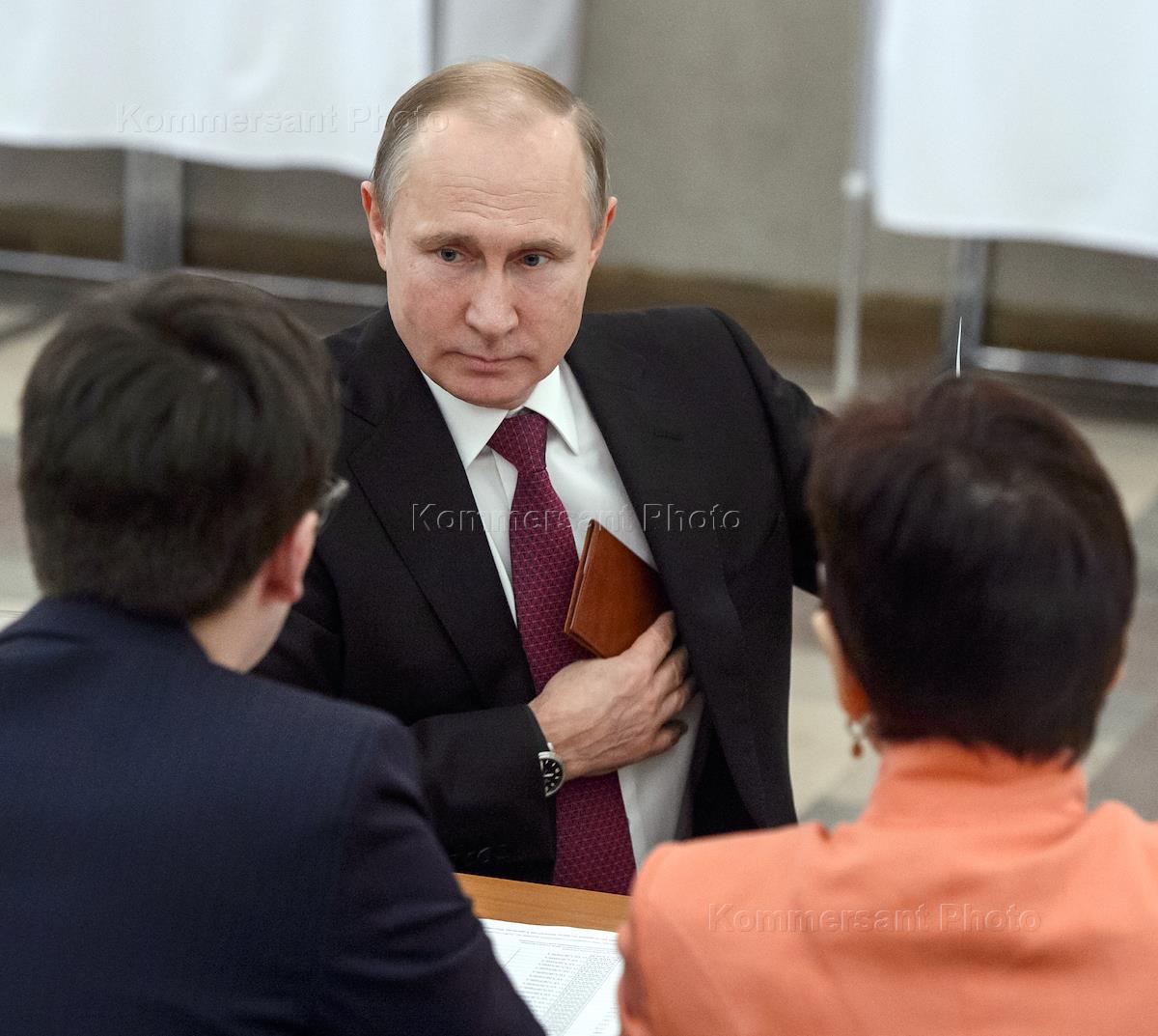 Выборы президента России. Кандидат на выборах в президенты России, действующий президент России Владимир Путин во время голосования на избирательном участке №2151 в Президиуме РАН.