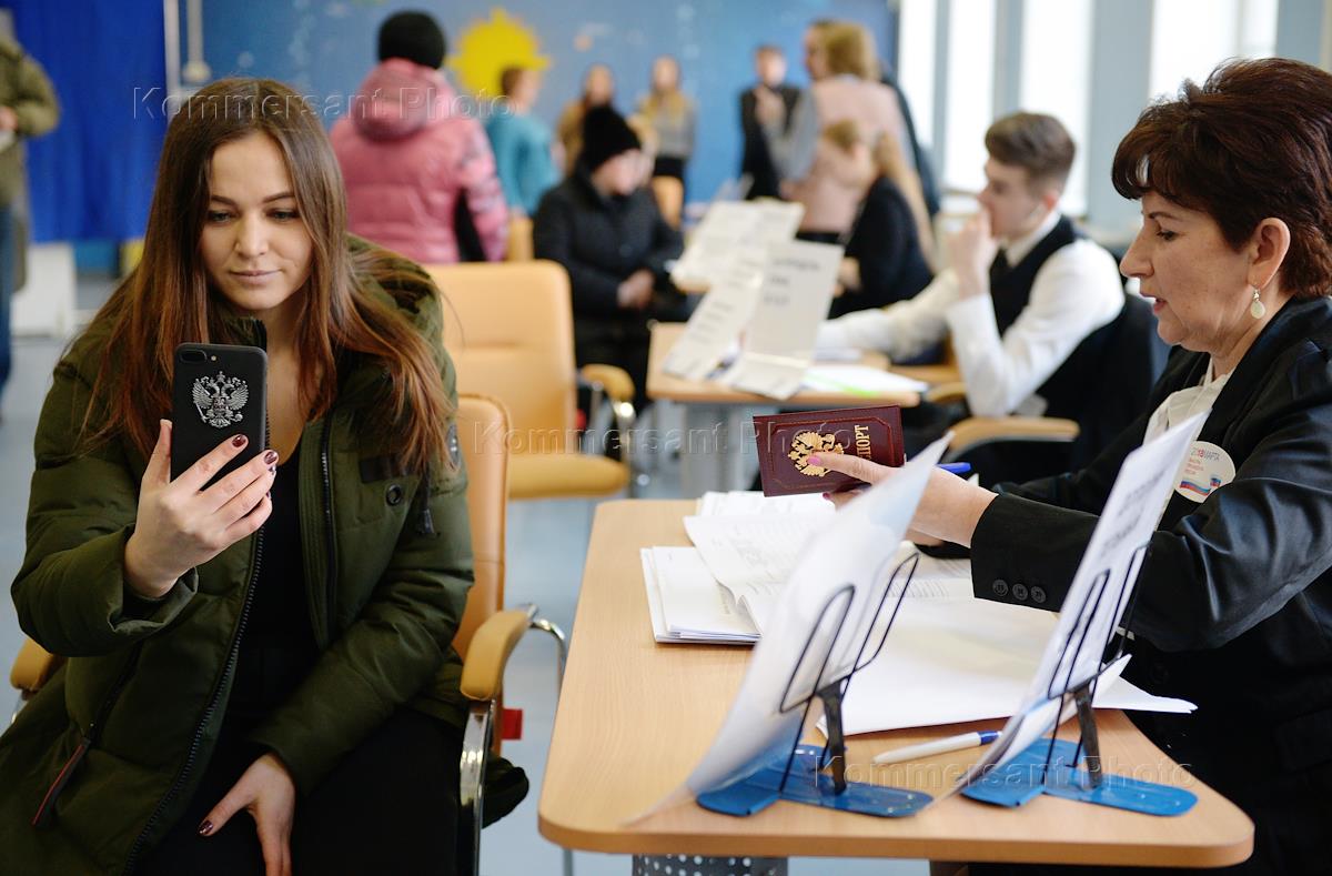 Выборы президента России. Избиратели во время голосования на избирательном участке.