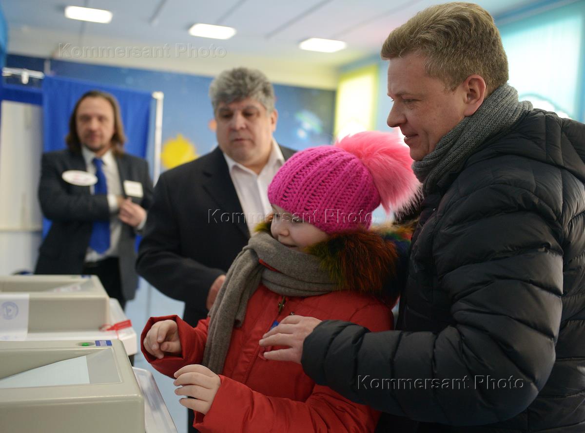 Выборы президента России. Мэр Москвы Сергей Собянин (слева) на избирательном участке № 90 во время голосования.