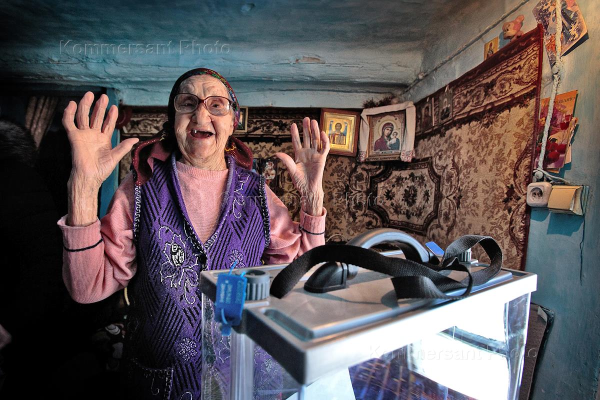 Выборы президента России. Голосование в селе Сосновка Искитимского района Новосибирской области. Избиратели во время выездного голосования.