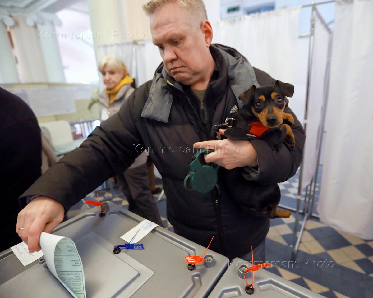 Выборы президента России. Избиратели во время голосования на одном из избирательных участков в Санкт-Петербурге.