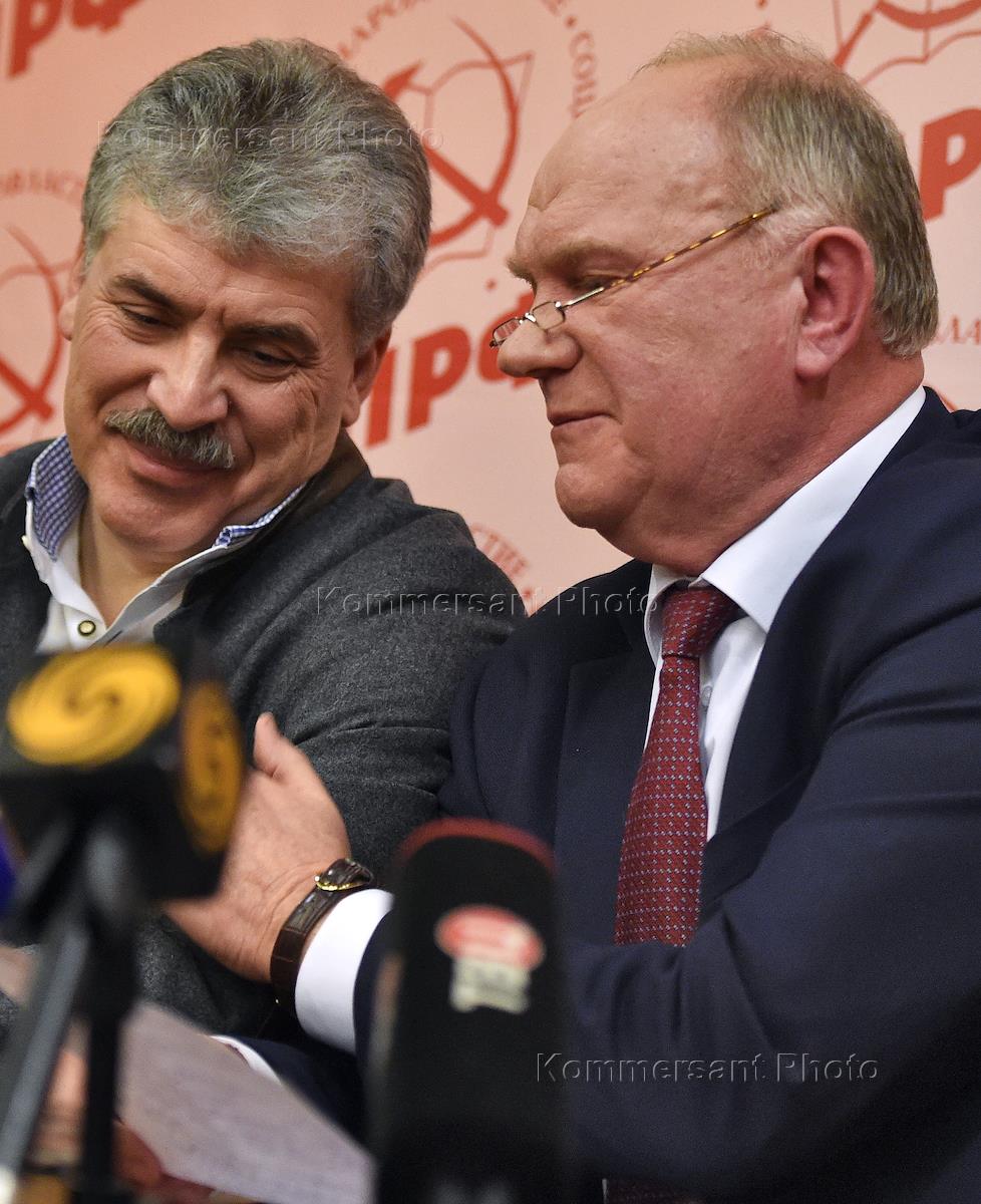 Presidential elections in Russia. Presidential candidate from Communist Party and the people's patriotic forces of Russia Pavel Grudinin (left) and the leader of the Communist Party of the Russian Federation Gennady Zyuganov (right) during the briefing at the headquarters.