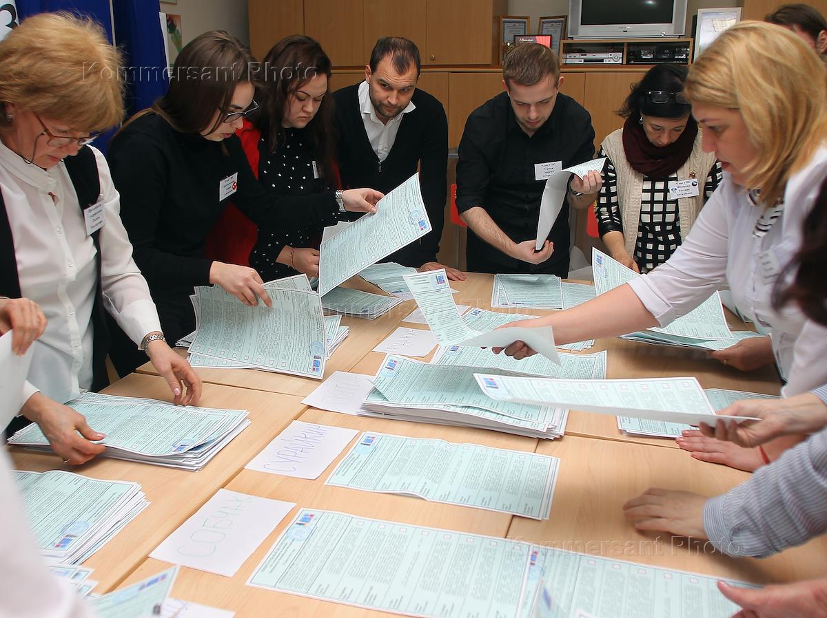 Выборы президента России. Выемка и подсчет избирательных бюллетеней в участковой избирательной комиссии № 1822.