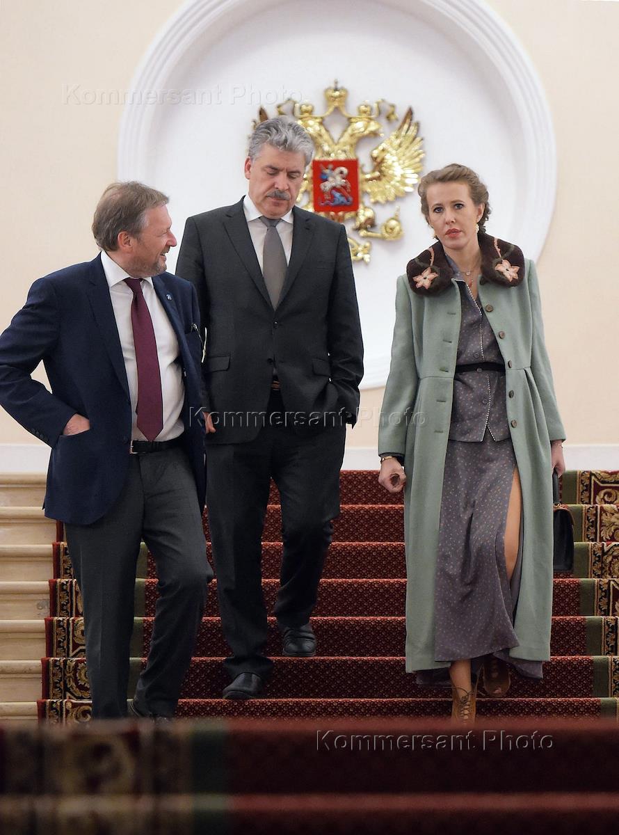 Russian President Vladimir Putin meeteng with presidential candidates in 2018 in Kremlin. From left to right: presidential candidates - from the "Party of Growth" Boris Titov, from the Communist Party and the "People's patriotic forces of Russia", director of the Lenin State Farm Pavel Grudinin, from the "Civic Initiative" party Ksenia Sobchak after the meeting.
