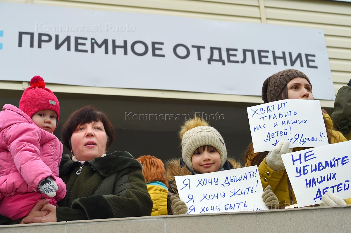 Участники митинга у здания городской больницы, куда были госпитализированы дети с диагнозом отравление, после выброса сероводорода на полигоне твердых бытовых отходов "Ядрово".