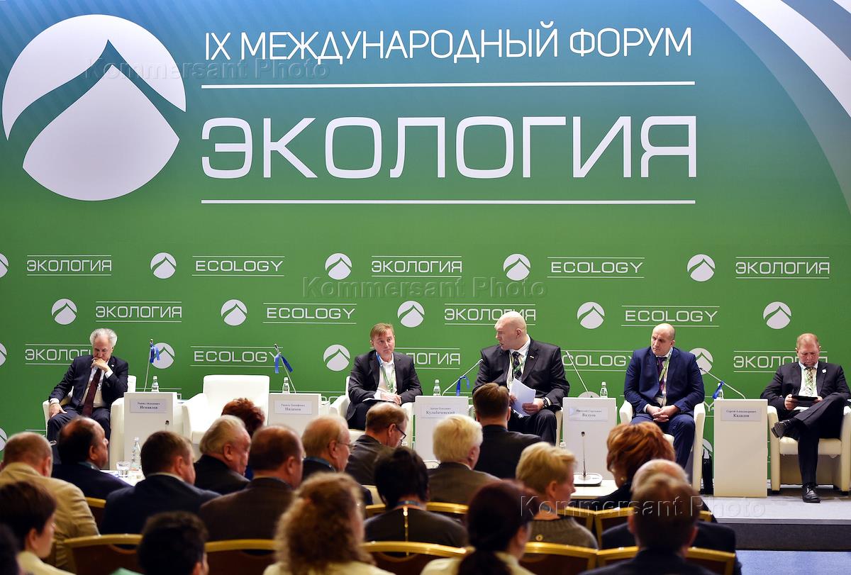 Пленарное заседание "Государственная политика в сфере охраны окружающей среды в Российской Федерации" в рамках IX-го международного форума "Экология" прошло в конгресс-парке гостиницы "Редиссон-Ройал. Москва". Первый заместитель председателя комитета Государственной думы России по экологии и охране окружающей среды Николай Валуев (второй слева) и руководитель департамента природопользования и охраны окружающей среды города Москвы Антон Кульбачевский (слева) во время заседания.