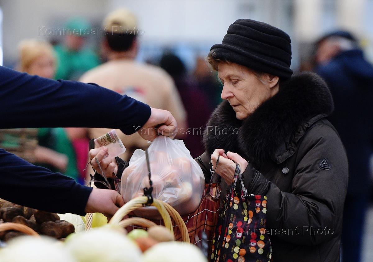 Велозаводский рынок после реконструкции. ПОжилая женщина покупает репчатый лук.