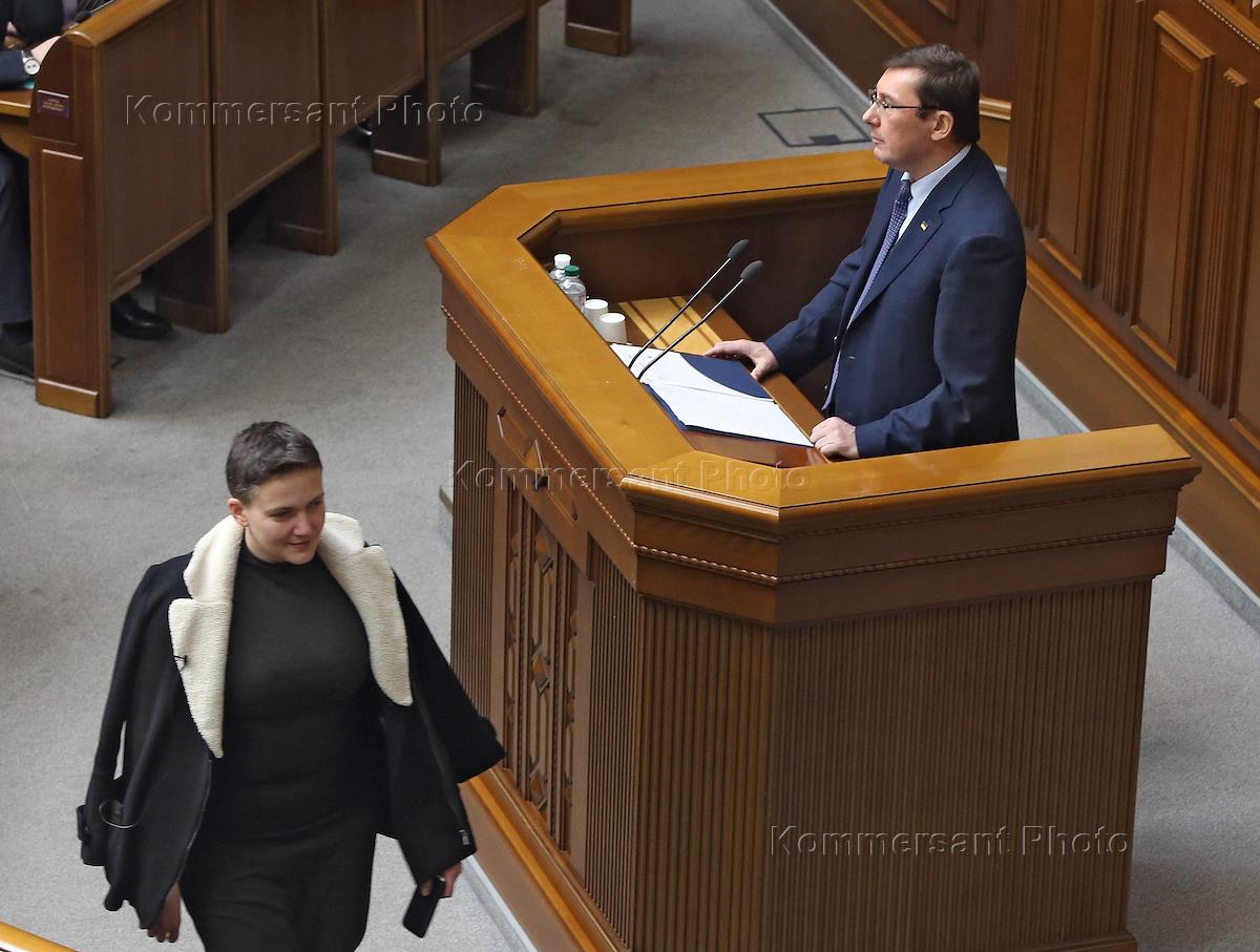 Голосование в Верховной Раде Украины (ВРУ) по вопросу лишения депутата ВРУ Надежды Савченко неприкосновенности и ее ареста по подозрению в подготовке теракта. Генеральный прокурор Украины Юрий Луценко (справа) во время заседания.