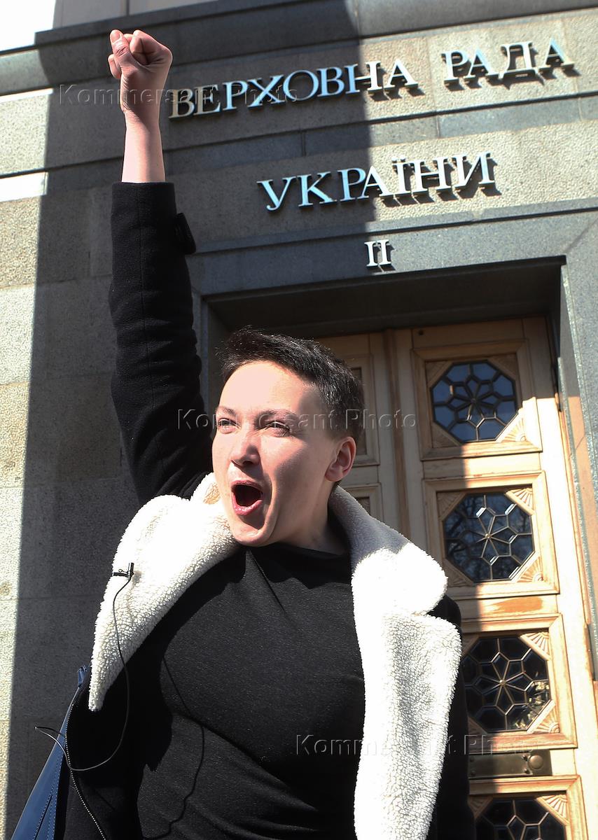Голосование в Верховной Раде Украины (ВРУ) по вопросу лишения депутата ВРУ Надежды Савченко неприкосновенности и ее ареста по подозрению в подготовке теракта. Депутат ВРУ Надежда Савченко после окончания заседания у здании Верховной Рады Украины.