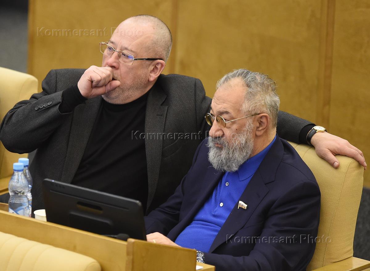 Пленарное заседание Государственной думы (ГД) России. Первый заместитель председателя комитета ГД России по делам национальностей Валерий Рашкин (слева) и член комитета ГД России по делам национальностей Александр Кравец (справа) во время заседания.