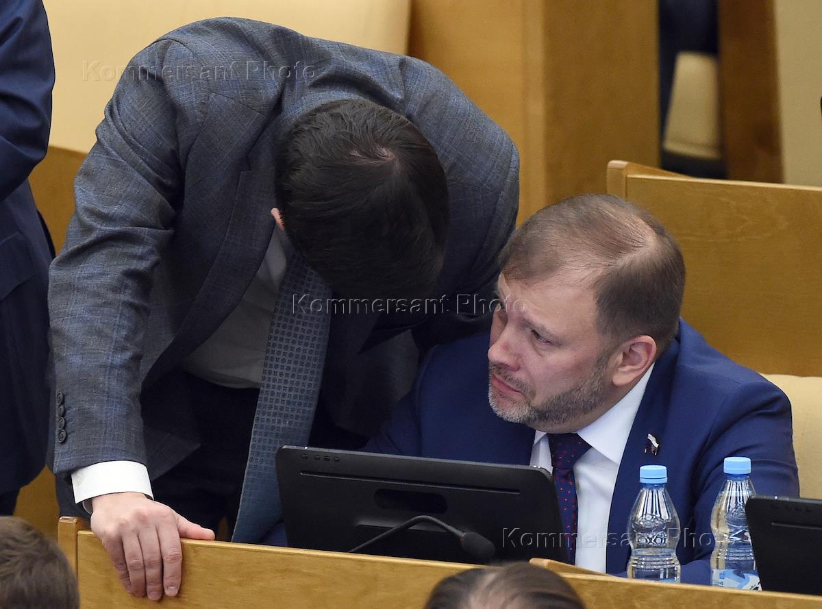 Пленарное заседание Государственной думы (ГД) России. Член комитета ГД России по развитию гражданского общества, вопросам общественных и религиозных объединений Григорий Аникеев (слева) и заместитель председателя комитета ГД России по жилищной политике и жилищно-коммунальному хозяйству Вадим Булавинов (справа) во время заседания.