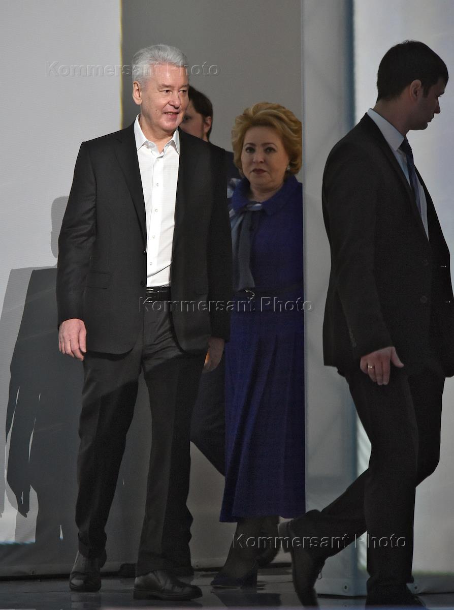 III Московский культурный форум 2018 прошел в Центральном выставочном зале "Манеж". Мэр Москвы Сергей Собянин (слева) и председатель Совета Федерации России Валентина Матвиенко (в центре) во время форума.