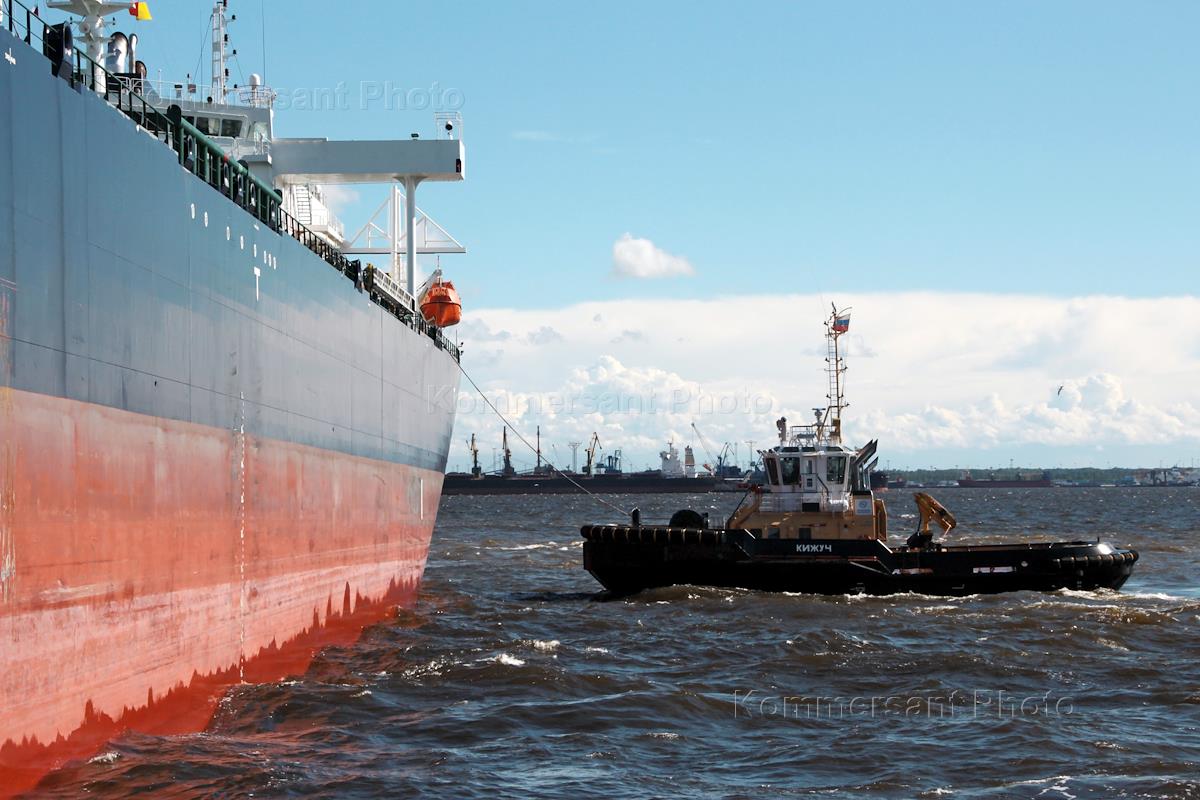 Морской торговый порт Усть-Луга. Портовые буксиры проводят постановку судна к причалу.