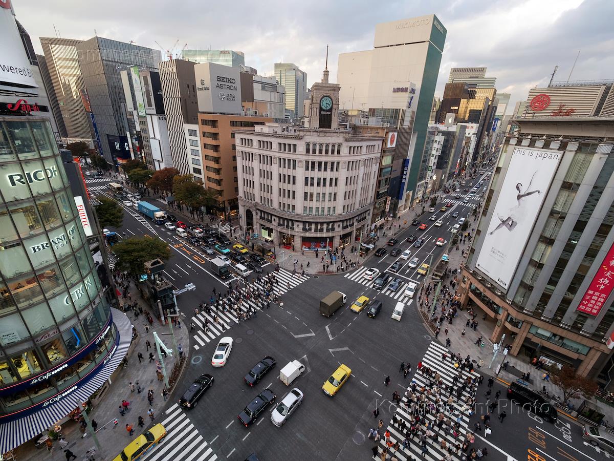 Виды Токио. Район Гиндза. Главный перекресток района Гиндза - пересечение улиц Chuo Dori и Harumi Dori.