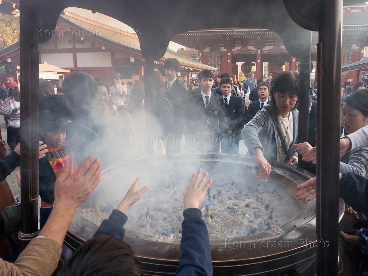 Виды Токио. Район Гиндза. Буддистский храм Сэнсо-дзи. Ритуал "обмазывания" дымом у курильницы с благовониями.