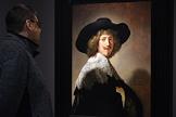 Пресс-показ, посвященный церемонии открытия выставки частного собрания голландской живописи XVII века супругов Каплан "Эпоха Рембрандта и Вермеера. Шедевры Лейденской коллекции" в Государственном музее изобразительных искусств (ГМИИ) имени Пушкина. Картина Рембрандта Харменса ван Рейна "Портрет Антони Копала" (1635 г.).