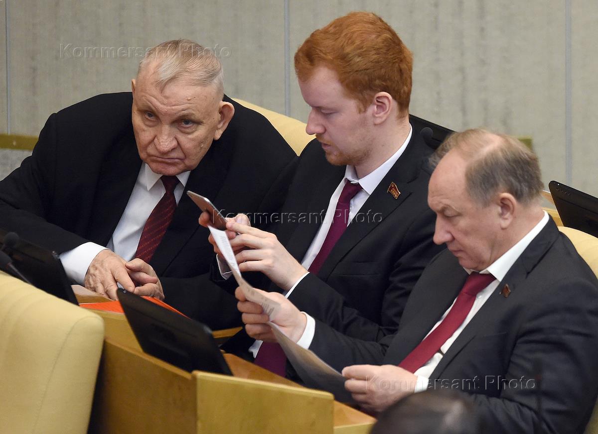 Пленарное заседание Государственной думы (ГД) России. Слева направо: заместитель председателя комитета ГД по Регламенту и организации работы Государственной думы Алексей Пономарев, член комитета ГД России по федеративному устройству и вопросам местного самоуправления Денис Парфенов и первый заместитель председателя комитета ГД России по делам национальностей Валерий Рашкин во время заседания.