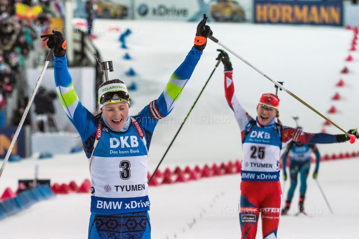 Кубок мира-2017/18 по биатлону. 9-й этап. Белорусская биатлонистка Дарья Домрачева (слева) и словацкая биатлонистка Паулина Фиалкова (справа) во время соревнований.
