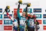 Кубок мира-2017/18 по биатлону. 9-й этап. Слева направо: белорусская биатлонистка Дарья Домрачева, словацкая биатлонистка Паулина Фиалкова и французская биатлонистка Анаис Шевалье во время церемонии наградения.
