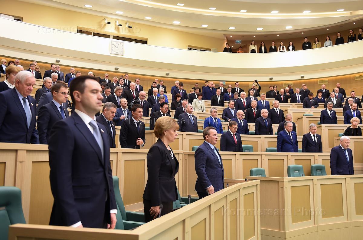 Пленарное заседание Совета Федерации (СФ) России. Минута молчания в память о жертвах пожара в торговом центре "Зимняя вишня" в Кемерове.