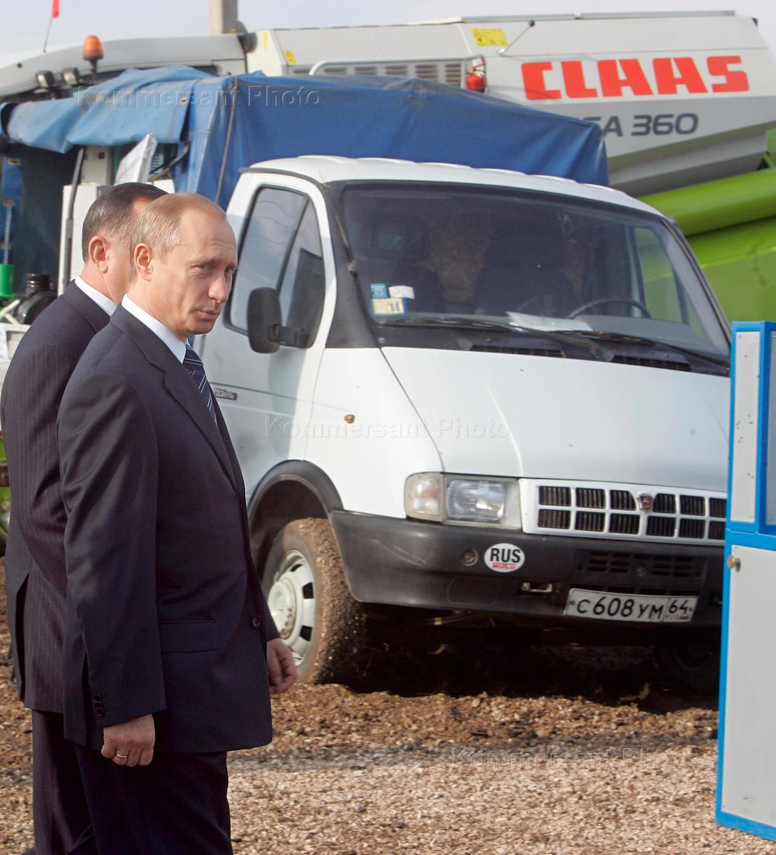 Министр сельского хозяйства России Алексей Гордеев (второй слева), Президент России Владимир Путин (второй справа) и представитель Президента России по Приволжскому федеральному округу Сергей Кириенко (третий слева) во время посещения агрофирмы "Николаевская". Агрофирма "Николаевская", расположенная в 10 км от Саратова, — одна из лучших фирм региона. Фирма специализируется на выращивании зерновых культур и животноводстве. Президент России прибыл в Саратов, чтобы провести выездное заседание президиума Госсовета, посвященное роли современных технологий в устойчивом развитии агропромышленного комплекса России.