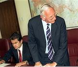 Комиссар ОБСЕ Макс ван дер Стул (слева) и министр России по делам федерации и национальной политики Александр Блохин (справа) на пресс-конференции.