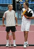 Российский теннисист Николая Давыденко (слева) и британский теннисист Грег Руседски (справа) на церемонии награждения на Международном турнире "Кубок Кремля - 2004" в спортивном комплексе "Олимпийский". Николай Давыденко впервые выиграл московский турнир.
