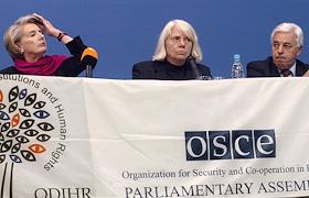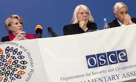 В воскресенье 17 октября в Белоруссии состоялись парламентские выборы (не прошел ни один кандидат от оппозиции) и референдум за предоставление президенту Белоруссии Александру Лукашенко возможность баллотироваться в третий раз (и далее неограничено)("за" - проголосовало 77,4% белорусов). Оппозиция и наблюдатели ОБСЕ (на фото) считают результаты выборов и референдума фальсифицированными. Глава миссии ОБСЕ/БДИПЧ по наблюдению за парламентскими выборами 2004 в республике Беларусь Одри Гловер (слева) и вице-президент Парламентской ассамблеи ОБСЕ Тоне Тингсгард (в центре) на пресс-конференции миссии в отеле Беларусь.