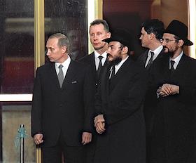 Исполнительный вице-президент Федерации еврейских общин России (ФЕОР) Александр Борода (слева), президент России Владимир Путин (в центре) и главный раввин России Берл Лазар (справа) на церемонии открытия Московского еврейского общинного центра в Марьиной роще.