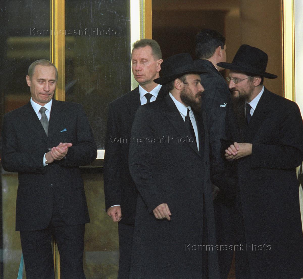 Президент России Владимир Путин (слева), начальник личной охраны президента России Виктор Золотов (второй слева), Исполнительный вице-президент Федерации еврейских общин России (ФЕОР) Александр Борода (в центре) и главный раввин России Берл Лазар (справа) на церемонии открытия Московского еврейского общинного центра в Марьиной роще.