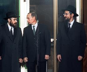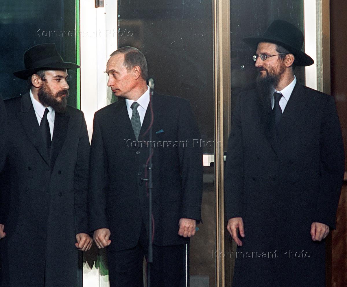 Исполнительный вице-президент Федерации еврейских общин России (ФЕОР) Александр Борода (слева), президент России Владимир Путин (в центре) и главный раввин России Берл Лазар (справа) на церемонии открытия Московского еврейского общинного центра в Марьиной роще.