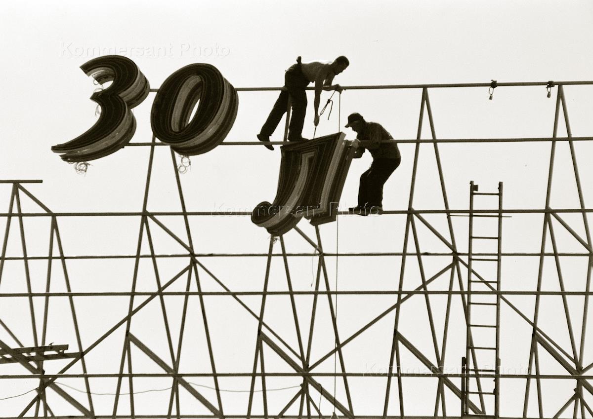 Жанровая фотография. Рабочие развешивают буквы на металлических конструкциях.