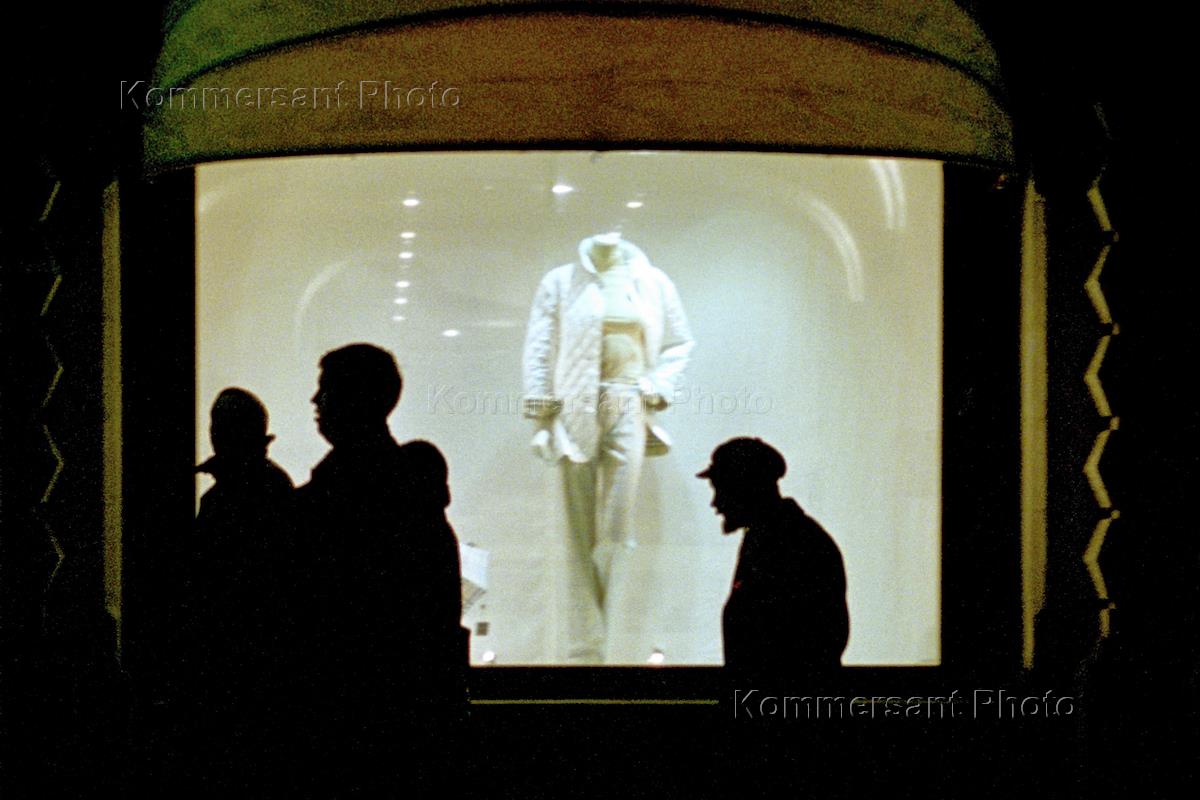 Жанровая фотография. Силуэт двойника В.И.Ленина на фоне витрины магазина.