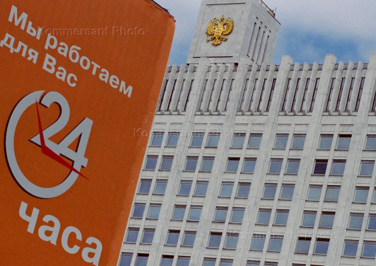 Жанровая фотография. Рекламный щит "Мы работаем для Вас 24 часа" на фоне Дома Правительства России.