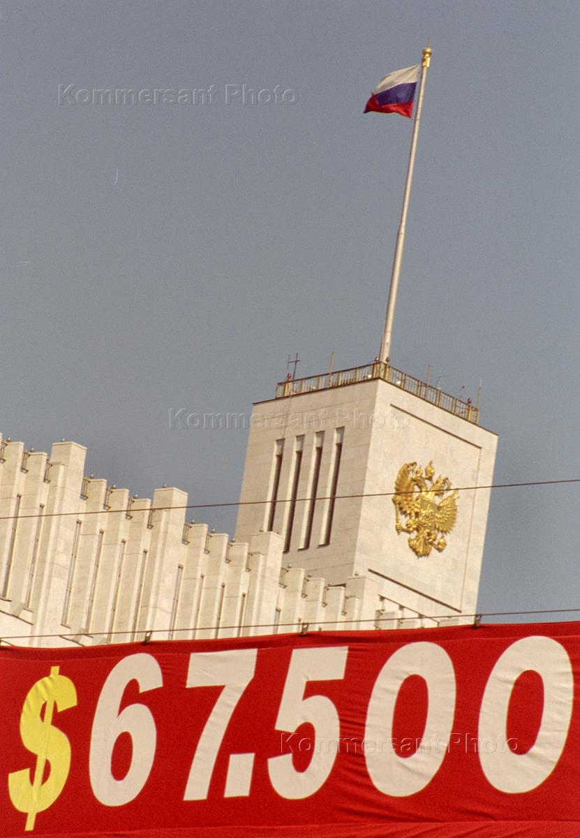 Жанровая фотография. Растяжка "$ 67,500" на фоне Дома Правительства России.