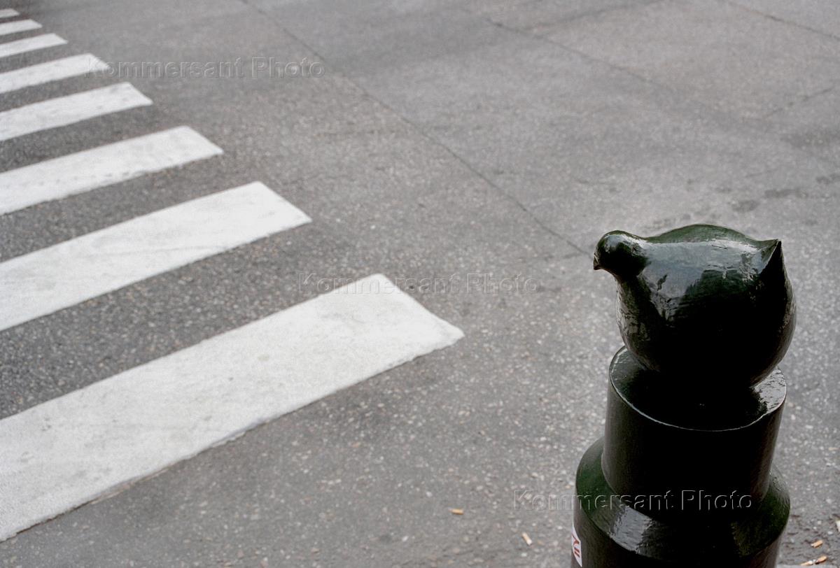 Жанровая фотография. Пешеходный переход (зебра) и столб с верхушкой в виде птички.