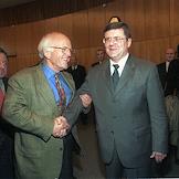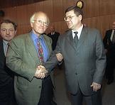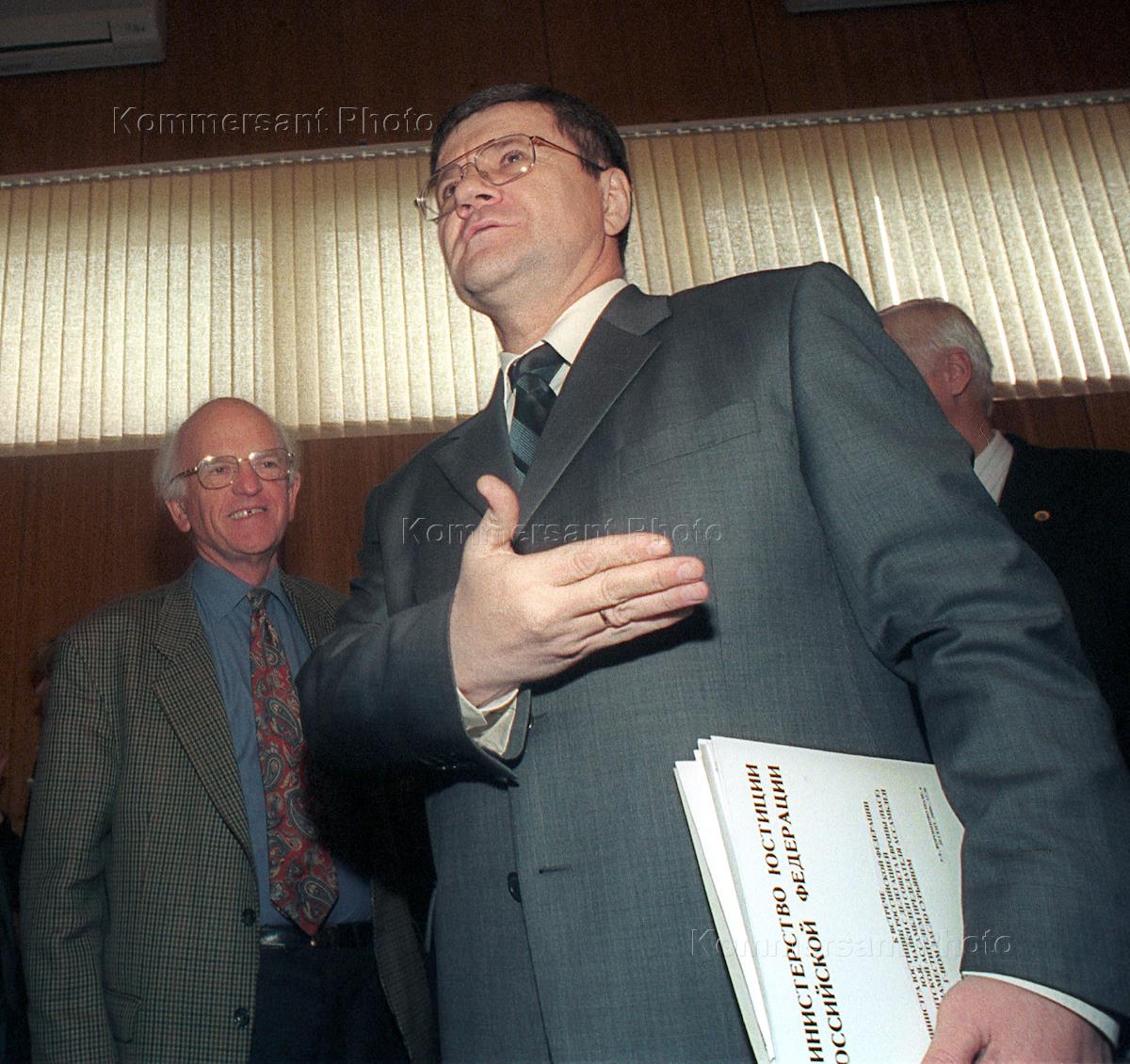 Глава делегации Парламентской ассамблеи Совета Европы (ПАСЕ) лорд Джадд (слева) и министр юстиции России Юрий Чайка во время встречи, на которой обсуждалось соблюдение прав человека в Чечне, в Министерстве юстиции.