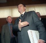 Глава делегации Парламентской ассамблеи Совета Европы (ПАСЕ) лорд Джадд (слева) и министр юстиции России Юрий Чайка во время встречи в Министерстве юстиции, на которой обсуждалось соблюдение прав человека в Чечне.