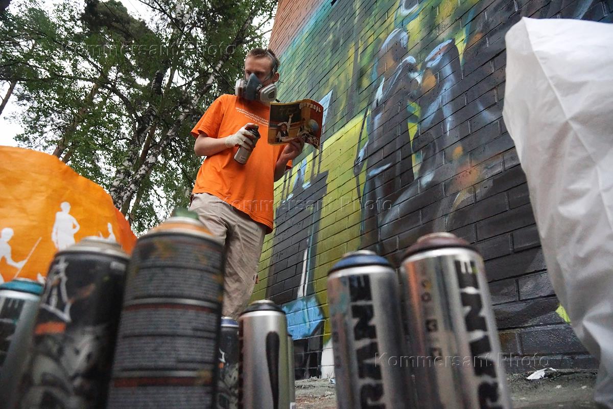Жанровая фотография. Художник-граффити рисует на стене.