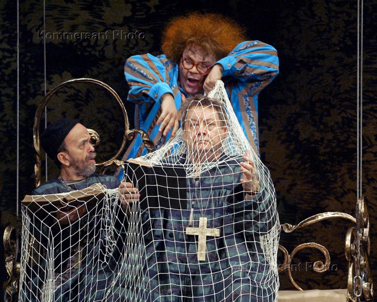 Прогон спектакля "Тартюф" Мольера в постановке режиссера Нины Чусовой на сцене МХАТ имени А.П.Чехова. В ролях: Тартюф - Олег Табаков (в центре), Лоран - Владимир Федоров (слева).