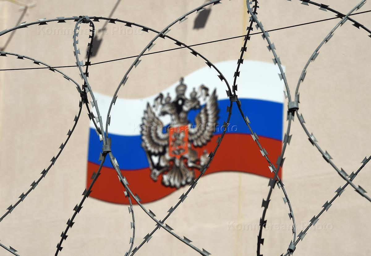 Жанровая фотография. Изображение флага и герба России на стене здания и колючая проволока.